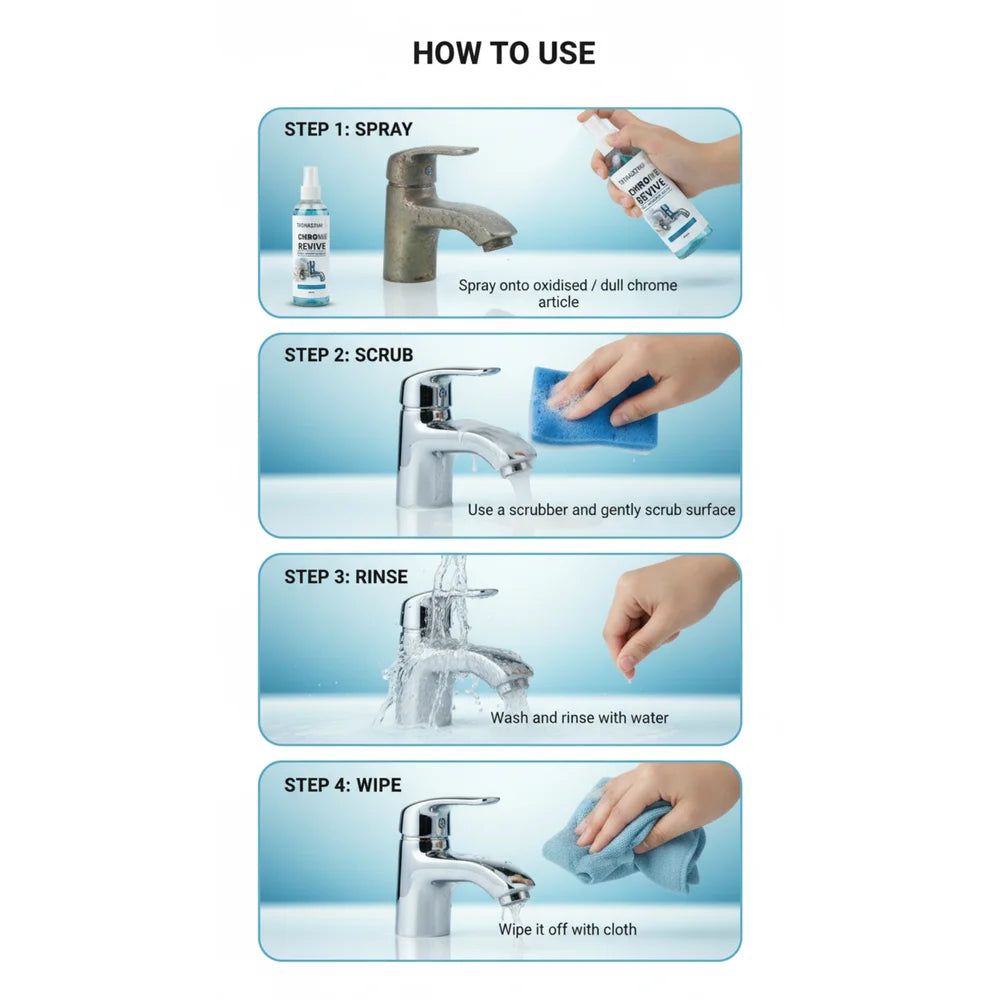 - Tathasthu Chrome revive : This 200ml liquid solution effortlessly removes tarnish, instantly restoring shine to your Chrome items. Ideal for Bathroom faucets, taps, shower heads, and chrome items. Easy to use and effective.
